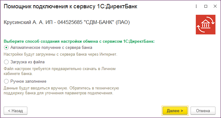 2.2. С помощью Помощника подключения к сервису 1С:ДиректБанк выполните необходимые настройки.