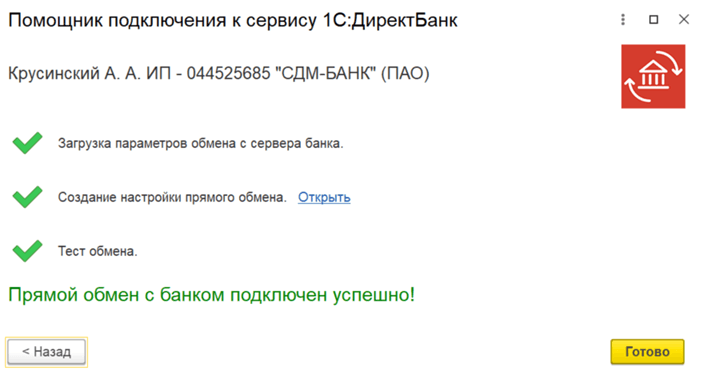2.3. В случае успешного подключения, помощник сообщит "Прямой обмен с банком подключен успешно".