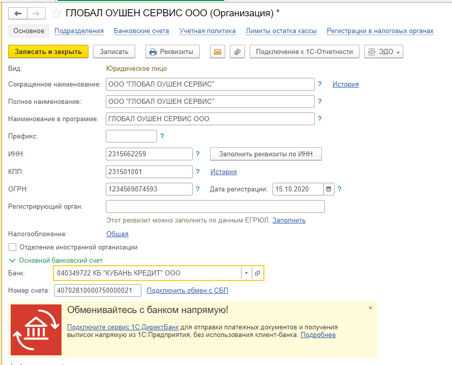 2. Выполните настройку в программе "1С:Бухгалтерия":
