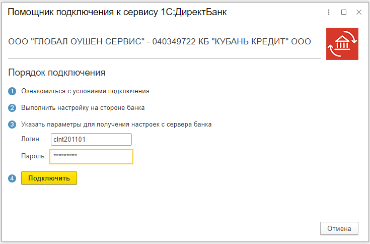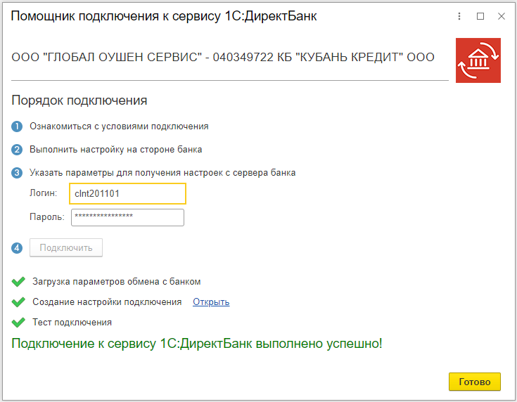 2.3. В случае успешного подключения, помощник сообщит "Прямой обмен с банком подключен успешно".