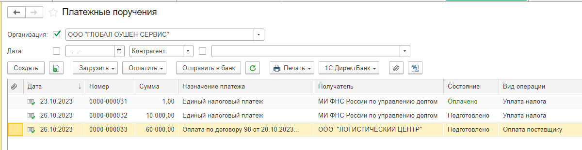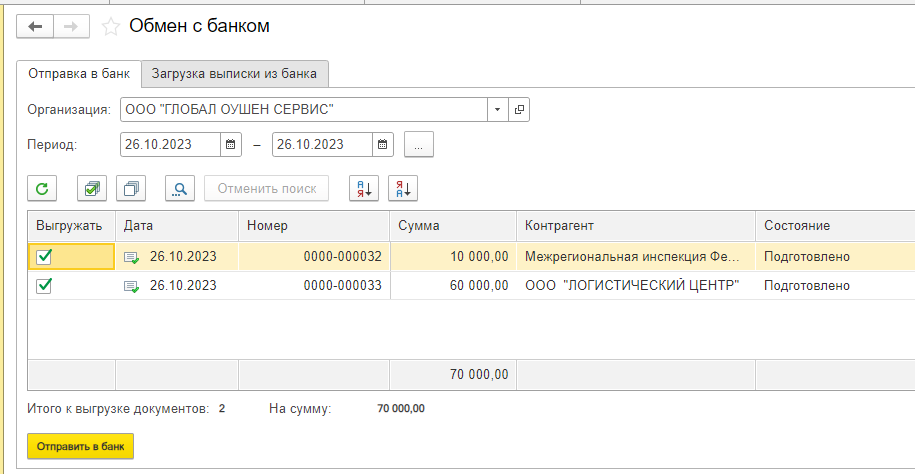 3. Для передачи подготовленных платежных получений в банк нажмите Отправить в банк.