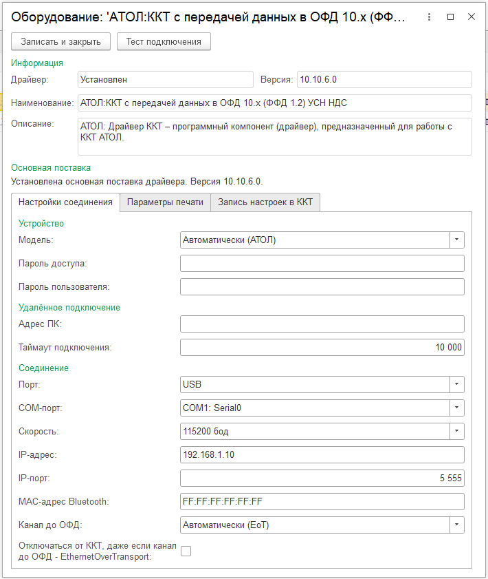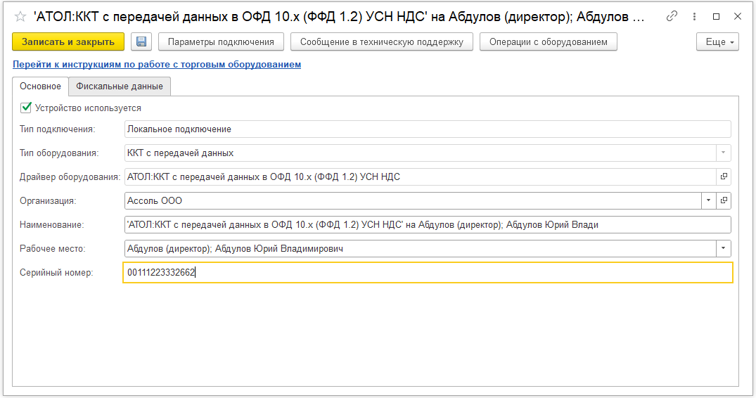 В открывшейся форме необходимо проверить, что установлен Тип оборудования: ККТ с передачей данных. В поле Драйвер оборудования выбрать из списка обработчик драйвера "АТОЛ:ККТ с передачей данных в ОФД 10.x (ФФД 1.2) УСН НДС". Далее необходимо выбрать Организацию, от имени которой будет производиться продажа товаров на данном фискальном регистраторе, ввести Наименование и Серийный номер ККТ (заводской номер, указанный на корпусе устройства). Нажать на кнопку Записать и закрыть.