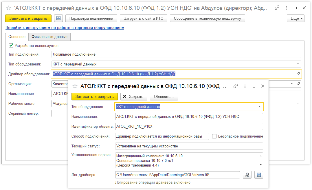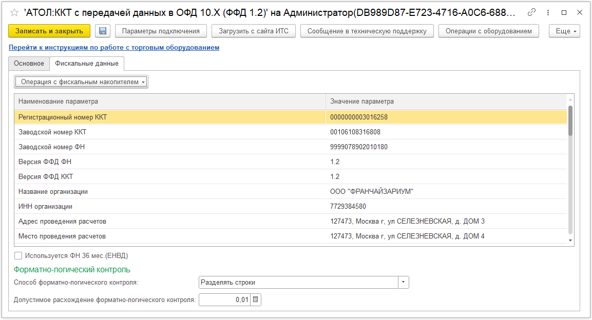 После записи будут доступны настройки параметров подключения и вкладка Фискальные данные. На этой вкладке доступны операции с фискальным накопителем, зарегистрированные данные фискального накопителя (считываются после первого открытия смены на ККТ), Форматно-логический контроль и другие параметры.