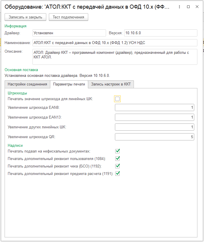 В тесте драйвера ККТ установить метку Включено.