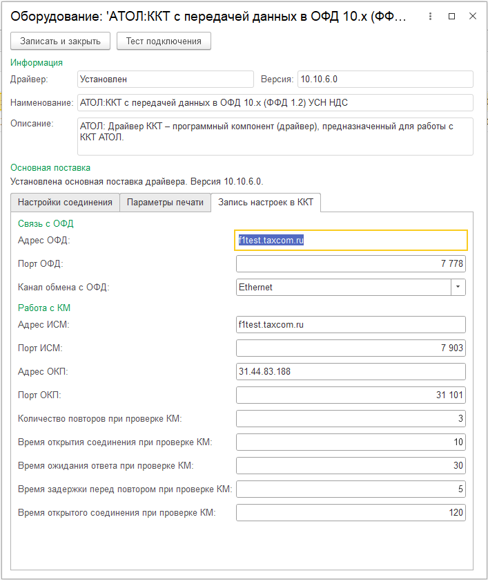 Все параметры подключения к ОФД указываются при регистрации фискального накопителя, повторно указывать на этой вкладке данные ОФД необязательно (Для версии 10.10.6.0 указание параметров обязательно). Но в случае изменения адресов можно оперативно во вкладке Запись настроек в ККТ записать в ККТ.