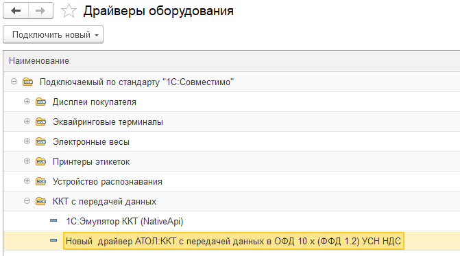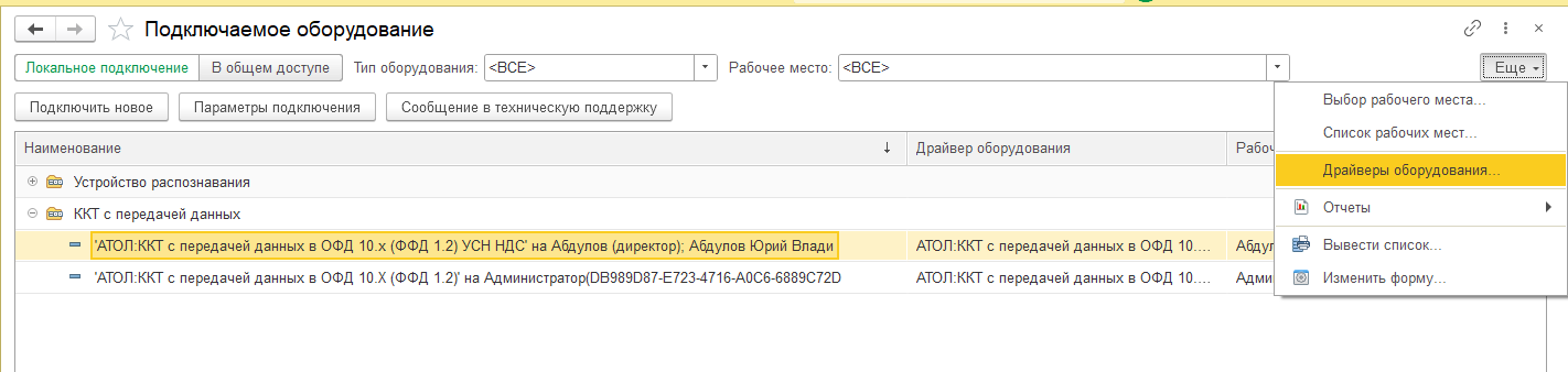 В справочнике Подключаемое оборудование следует нажать кнопку Еще и выбрать в меню Драйверы оборудования.