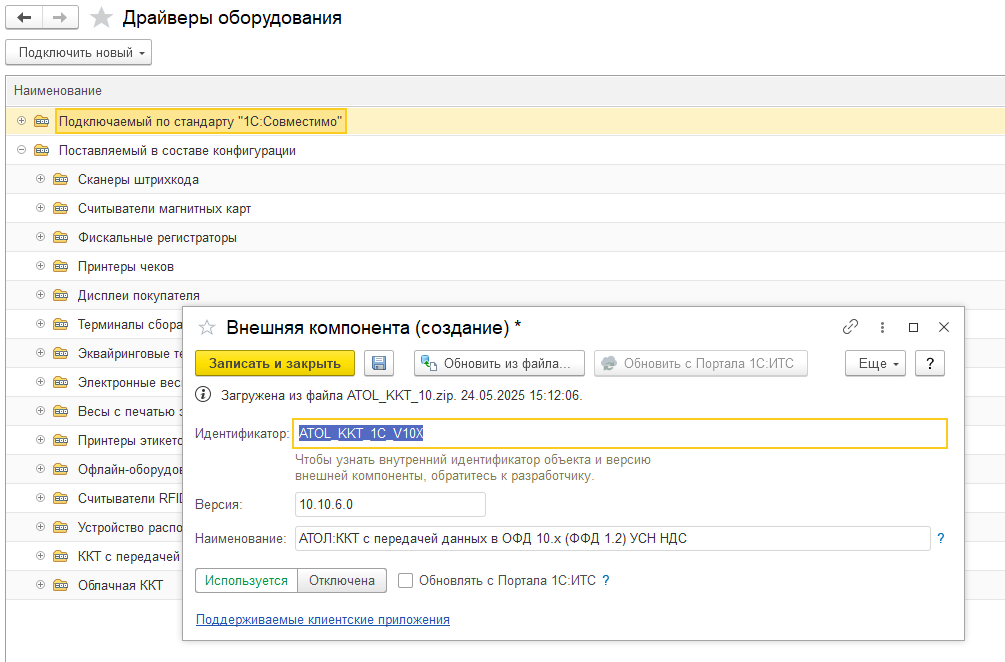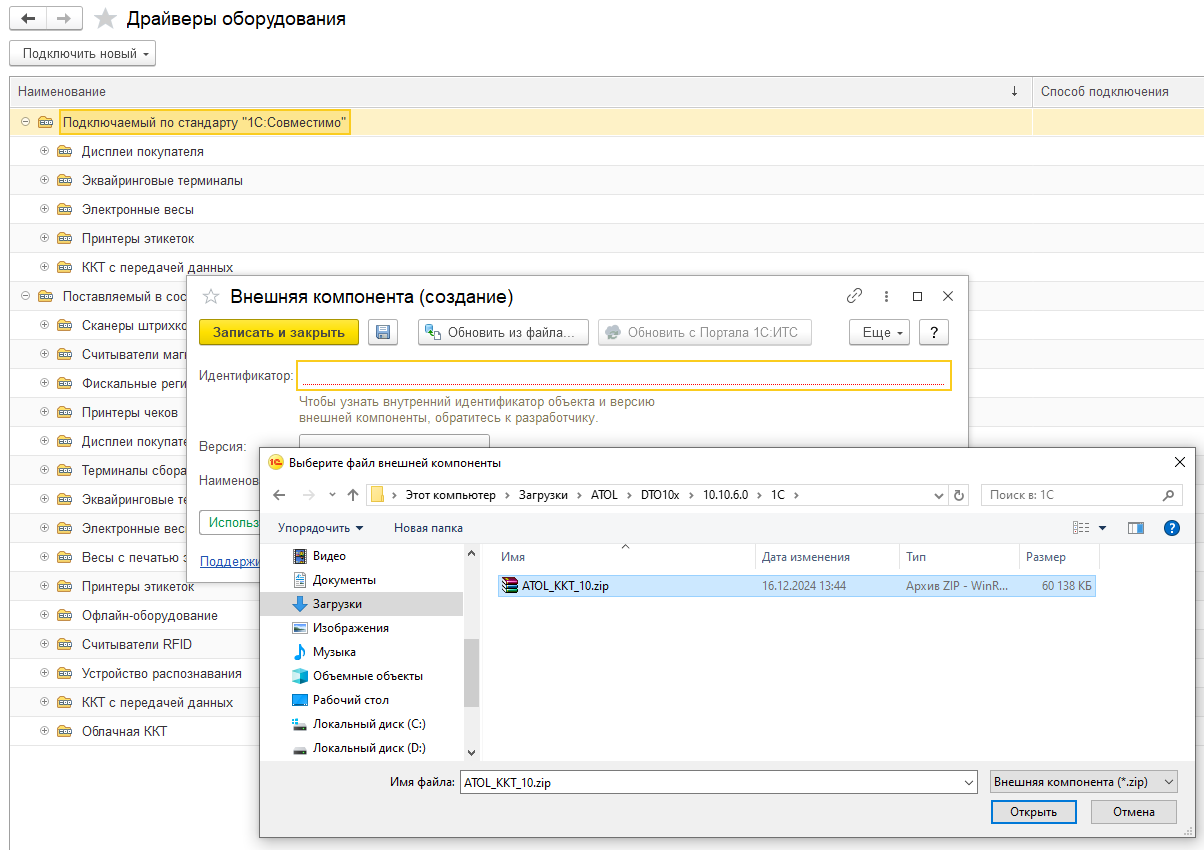 Интеграционная компонента драйвера ККТ АТОЛ 10.х входит в состав "1С:Библиотеки подключаемого оборудования", но при необходимости компоненту можно добавить самостоятельно. Добавленные вручную Интеграционные компоненты драйвера ККТ АТОЛ 10.х нельзя будет обновлять автоматически.