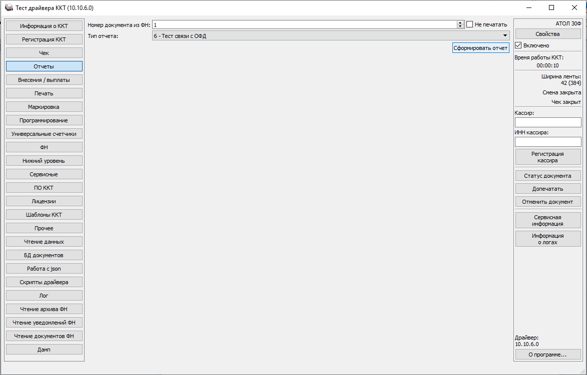 Далее открыть вкладку Отчеты. Выбрать Тип отчета – 6-Тест связи с ОФД, нажать кнопку Сформировать отчет.