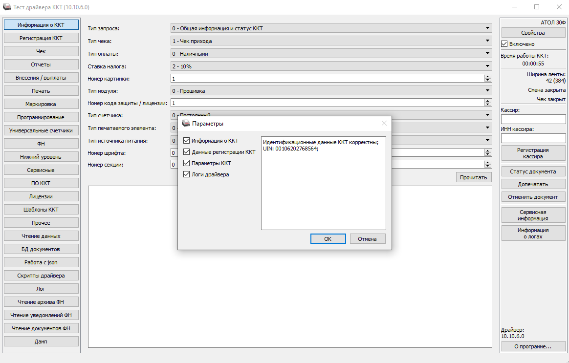 Запустить Тест драйвера ККТ АТОЛ из меню Пуск.