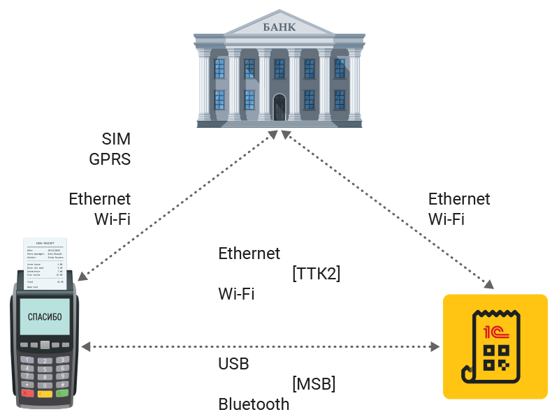 Если терминал установлен на стационарном рабочем месте кассира и соединен с компьютером под управлением ОС Windows или Linux, и установленной программой 1С, то оптимальным вариантом будет подключение терминала с использованием интерфейса USB.