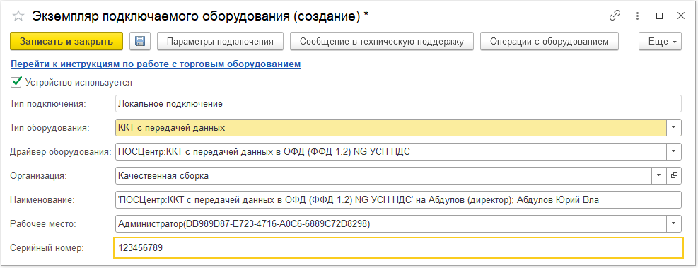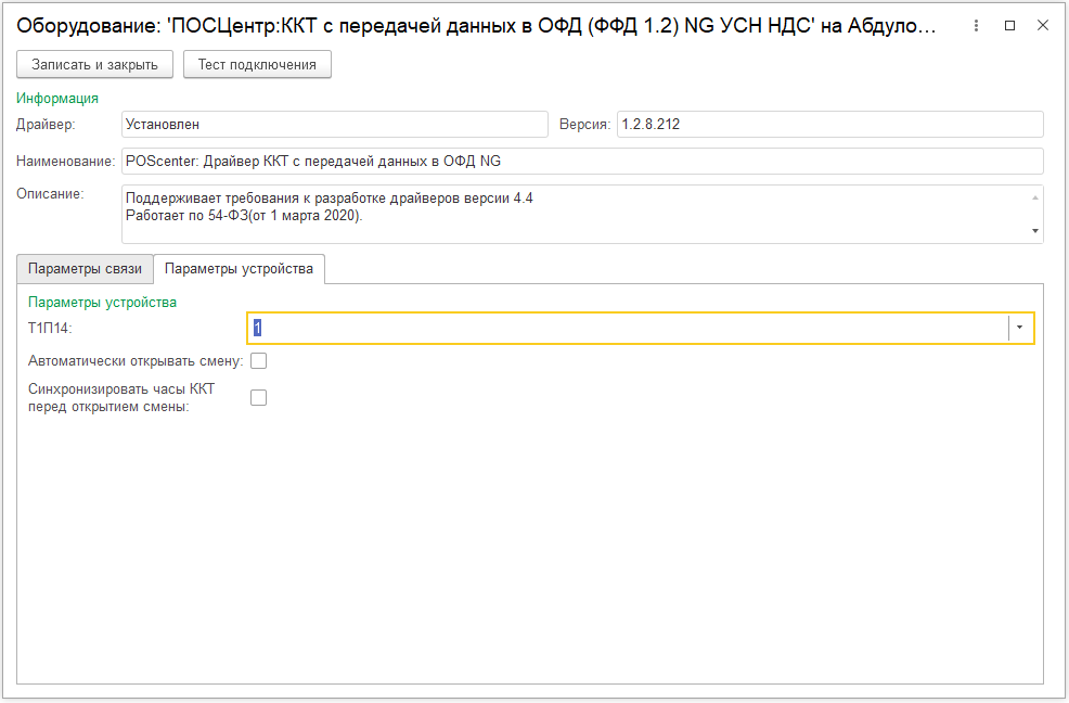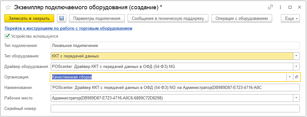 В открывшейся форме необходимо проверить, что установлен Тип оборудования: ККТ с передачей данных. В поле Драйвер оборудования выбрать из списка обработчик драйвера "ПОСЦЕНТР:ККТ с передачей данных в ОФД (ФФД 1.2) NG УСН НДС". Далее необходимо выбрать Организацию, от имени которой будет производиться продажа товаров на данном фискальном регистраторе, ввести Наименование и Серийный номер ККТ (заводской номер, указанный на корпусе устройства). Нажать на кнопку Записать и закрыть.
