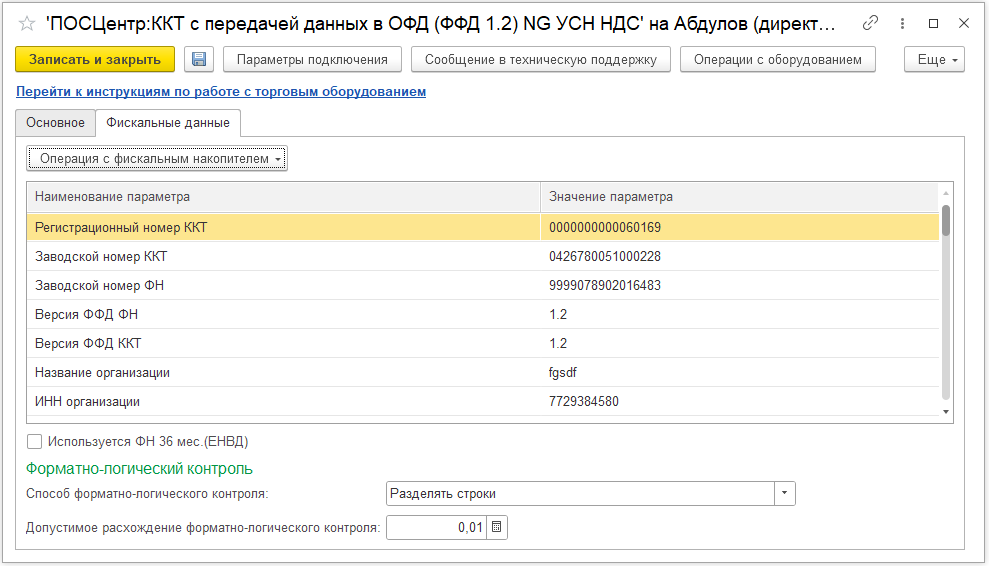 После записи будут доступны настройки параметров подключения и вкладка Фискальные данные. На этой вкладке доступны операции с фискальным накопителем, зарегистрированные данные фискального накопителя (считываются после первого открытия смены на ККТ), Форматно-логический контроль и другие параметры.