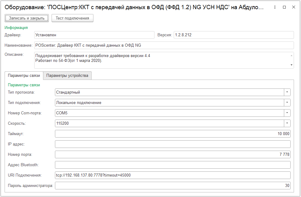 Также в окне Подключение оборудования станет доступной кнопка Параметры подключения. С ее помощью можно сразу открыть настройки подключения выбранного экземпляра оборудования.