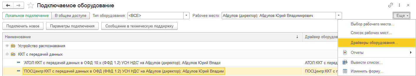 В справочнике Подключаемое оборудование следует нажать кнопку Еще и выбрать в меню Драйверы оборудования.