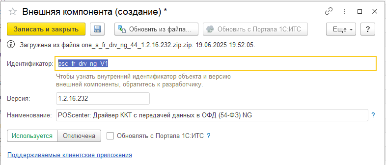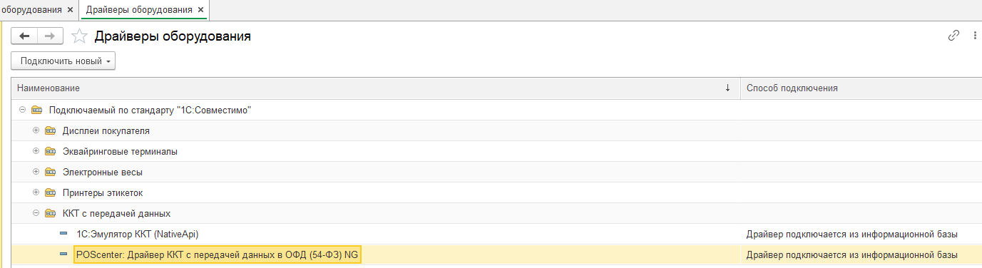 Интеграционная компонента драйвера NG ККТ ПОСЦЕНТР входит в состав "1С:Библиотеки подключаемого оборудования", но при необходимости компоненту можно добавить самостоятельно. Добавленные вручную Интеграционные компоненты драйвера NG ККТ ПОСЦЕНТР нельзя будет обновлять автоматически.