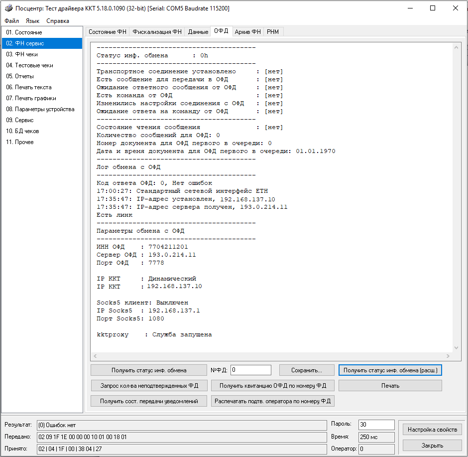 Перейти в раздел 02. ФН Сервис. Открыть вкладку ОФД. Нажать кнопку Получить статус инф. обмена (расш.).