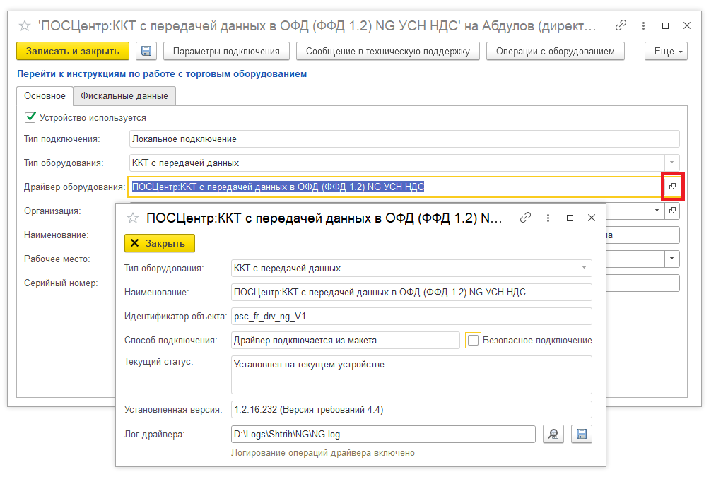 На форме указывается версия интеграционной компоненты драйвера NG ККТ ПОСЦЕНТР.