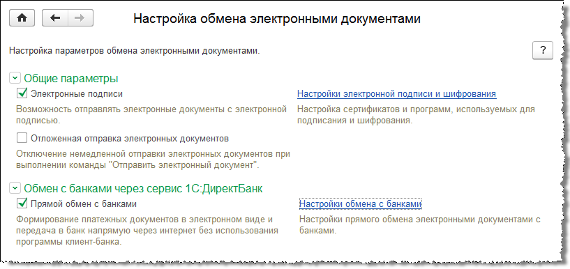 В большинстве случаев прямой обмен с банками предполагает обязательное использование электронных подписей. Если ранее этого еще не делалось, то в первую очередь следует установить программу электронной подписи и сертификат электронной подписи на компьютере, и уже после этого переходить к настройкам сервиса "1С:ДиректБанк" в "1С".