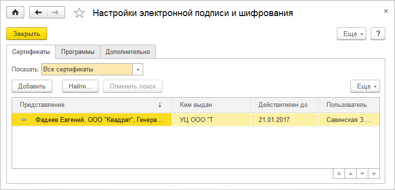 В результате настройки электронной подписи в программе должен быть указан сертификат электронной подписи, который будет использоваться для прямого обмена.