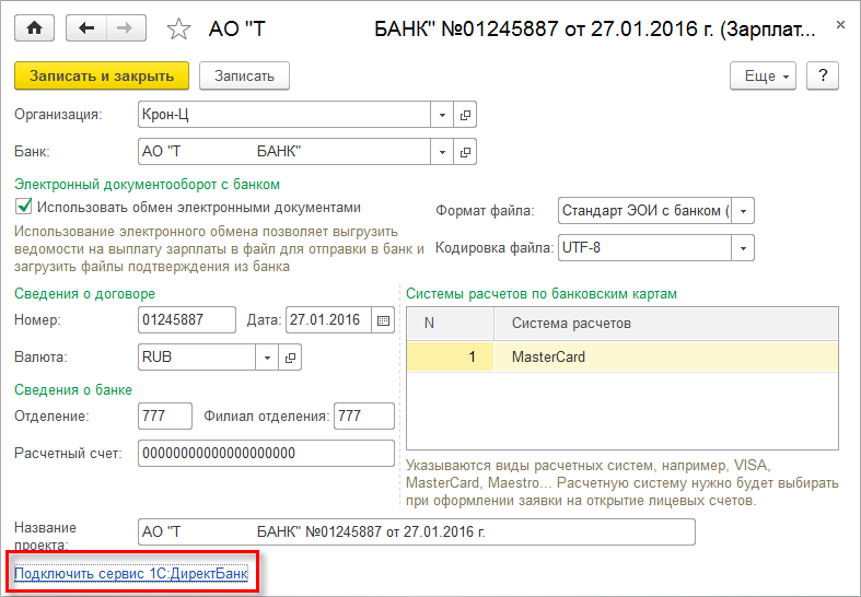 Настройку прямого обмена с банком можно начать непосредственно из карточки зарплатного проекта по ссылке "Подключить сервис 1С:ДиректБанк". Ссылка доступна, если указано, что используется электронный обмен с банком, и выбранный банк поддерживает технологию прямого обмена.