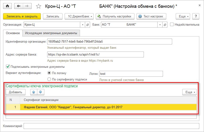 При успешном исходе в программе будет создана настройка обмена с банком. Для окончательного завершения настройки в ней следует указать предварительно установленный сертификат ключа электронной подписи.