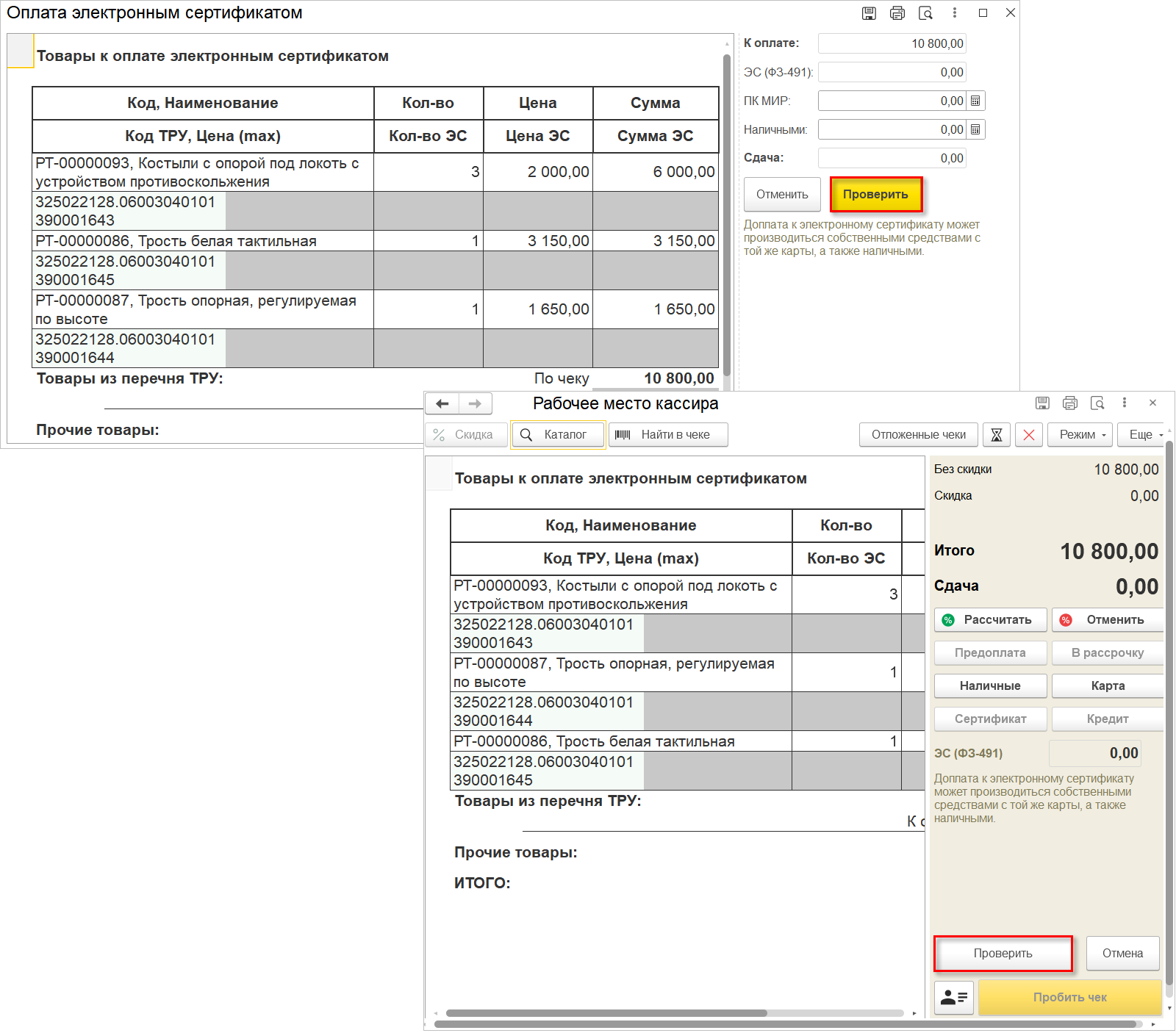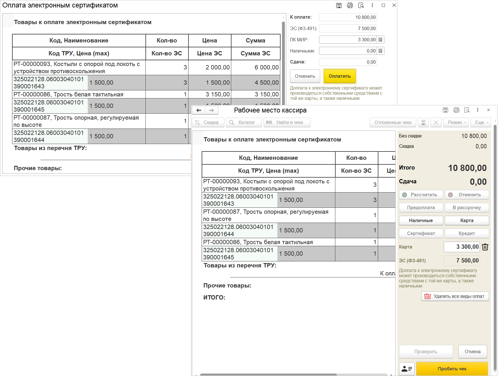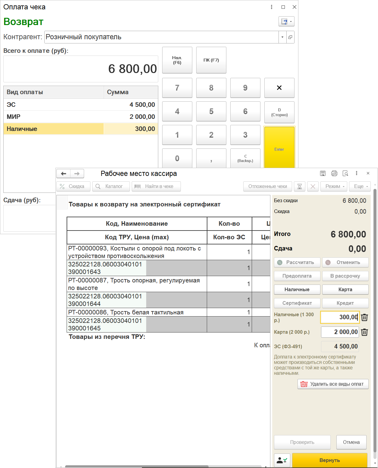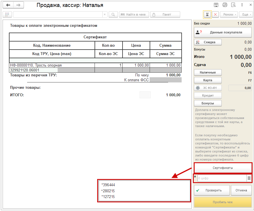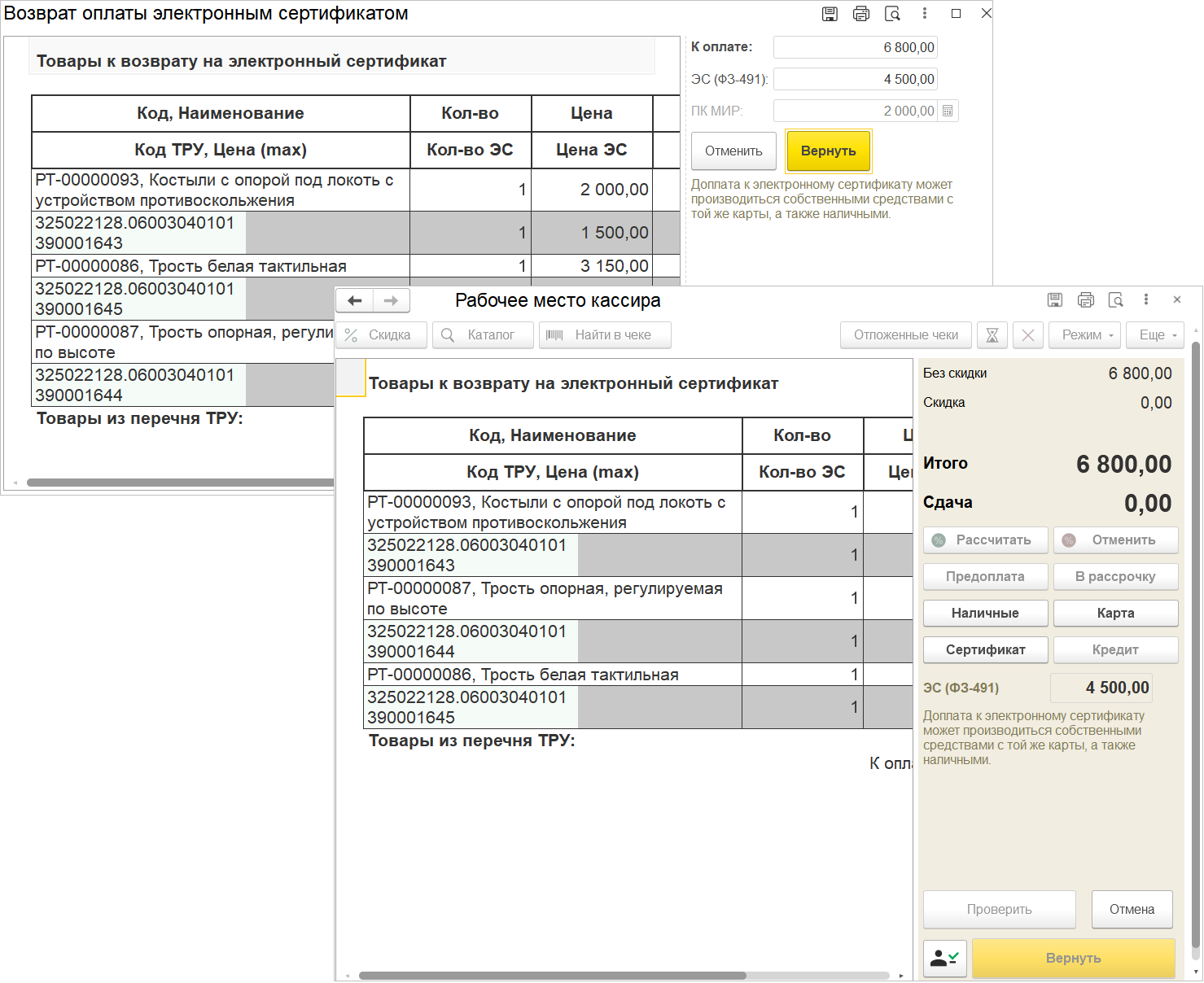 В связи с тем, что с 27.09.2021 г. вступил в силу федеральный закон от 30 декабря 2020 г. № 491-ФЗ "О приобретении отдельных видов товаров работ, услуг с использованием электронного сертификата" в программе "1С:Розница" был поддержан учет и оплата товаров и услуг из перечня, предусмотренного частью 6 статьи 3 Федерального закона от 30.12.2020 № 491-ФЗ (далее – перечень ТРУ), новым способом - электронными сертификатами (ЭС).
