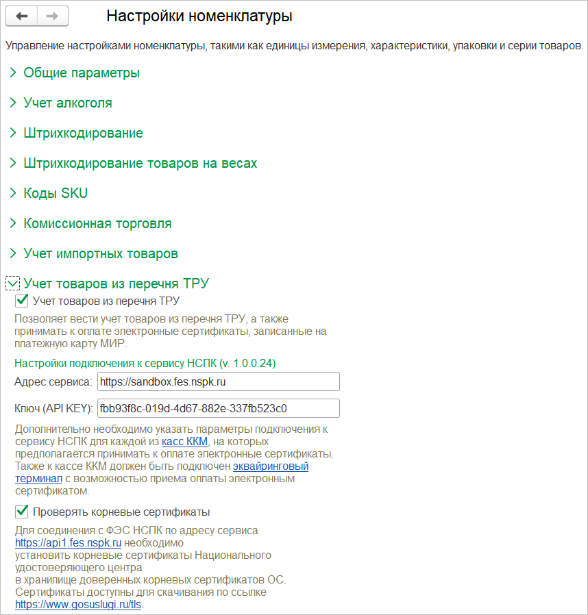 В разделе Учет товаров из перечня ТРУ (Администрирование - Настройки номенклатуры) пользователь должен установить одноименный флаг. Также необходимо внести общие данные для подключения к системе НСПК, полученные в личном кабинете ЛК ФЭС: