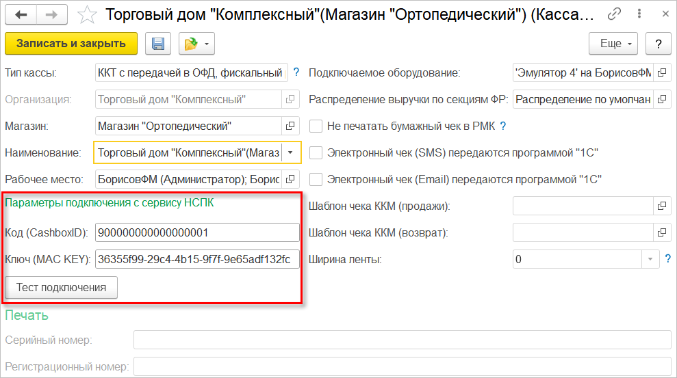В карточке ККТ для подтверждения готовности кассы к приему оплат электронными сертификатами и корректности настройки сетевого соединения с НСПК необходимо провести echo test по кнопке Тест подключения.