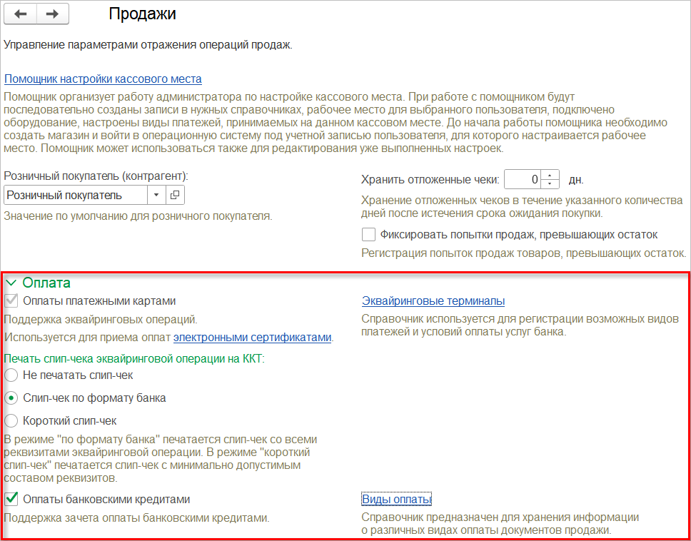 Далее необходимо перейти к настройке эквайрингового терминала. Удобно это сделать с помощью одноименной ссылки, расположенной в той же группе Оплата (Администрирование – Продажи).
