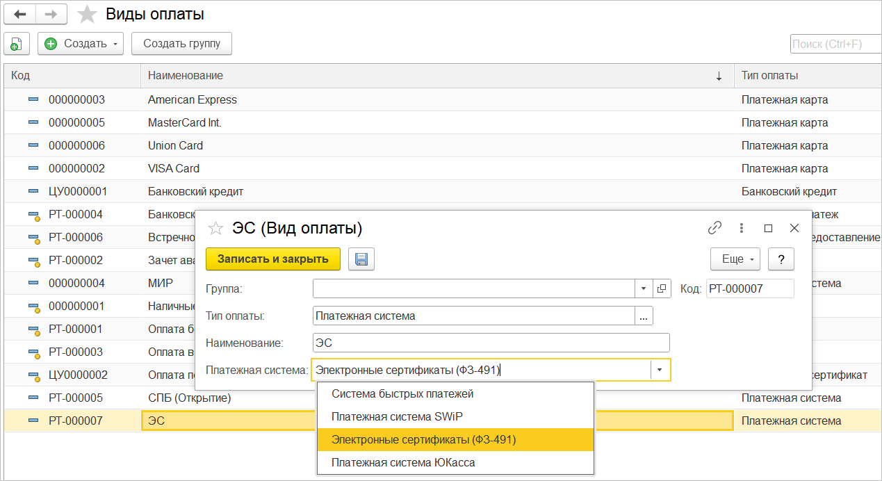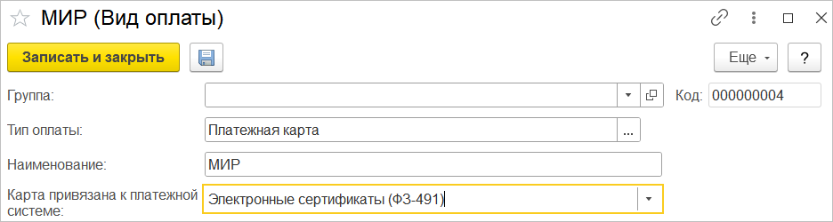 Следом нужно настроить вид оплаты с типом оплаты Платежная карта, указав ту же платежную систему - Электронные сертификаты (ФЗ-491). Таким образом, будет связан один вид оплаты с другим, оплата картой и оплата электронным сертификатом.
