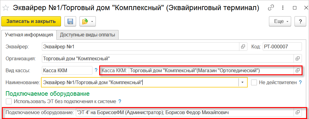 В карточке эквайрингового терминала нужно выбрать кассу ККМ, настроенную для работы с НСПК. Также необходимо выбрать соответствующий экземпляр подключаемого оборудования (эквайринговый терминал).