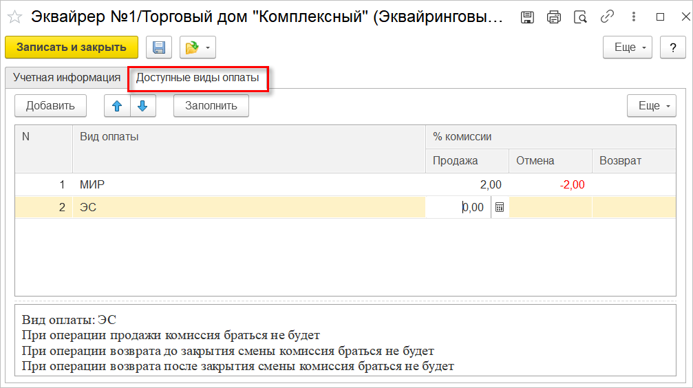 Затем в карточке терминала необходимо перейти на вкладку Доступные виды оплаты на терминале и добавить ранее созданные элементы с типом Платежная система и Платежная карта с привязкой к платежной системе Электронные сертификаты (ФЗ-491). Завершить настройку оборудования следует сохранением внесенных данных.