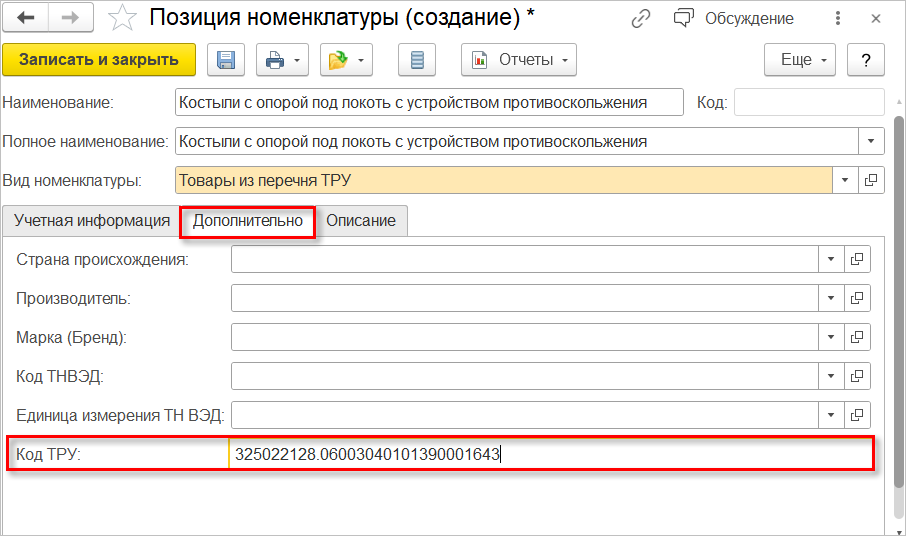 При включенной опции учета товаров и услуг из перечня ТРУ на закладке Дополнительно в карточке товара появляется возможность ввести вручную параметр Код ТРУ.