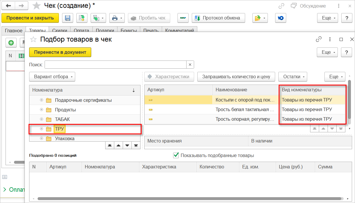 Для удобства подбора товаров и услуг из перечня ТРУ можно выделить их в отдельную группу, а также создать отдельный вид номенклатуры. В чек, наряду с такими позициями, можно добавлять любые товары без ограничения.