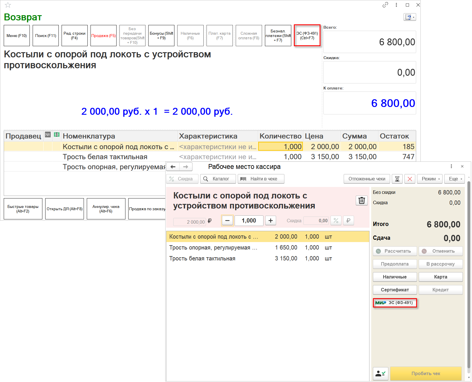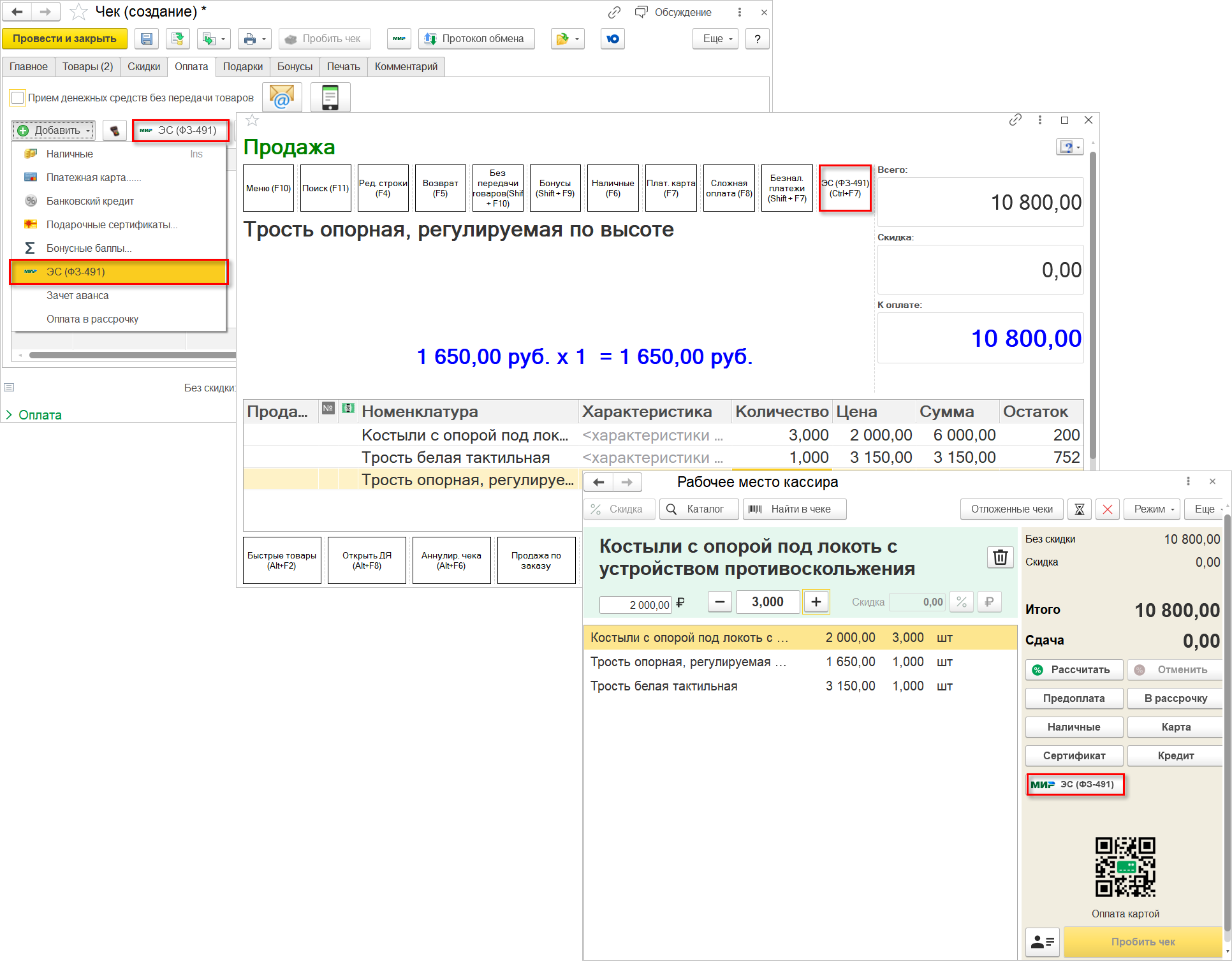 При оформлении оплаты для перехода к предварительной проверке ее возможности электронным сертификатом и последующей оплате необходимо нажать кнопку ЭС (ФЗ-491). На рисунке ниже данная команда продемонстрирована в нескольких местах оформления продаж: документ Чек, старое РМК и новое РМК.