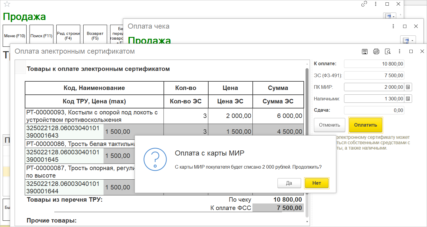 При использовании оплат ЭС товаров и услуг из перечня ТРУ, рекомендуется обновить программу "1С:Розница" до актуальной версии и установить все "свежие" исправления.