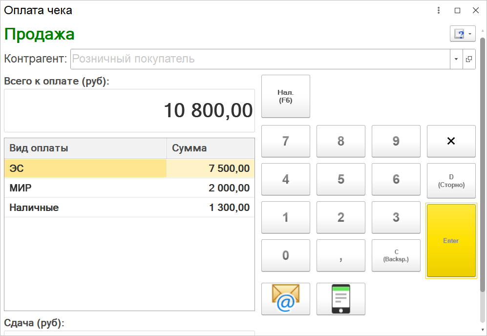 При работе с ЭС стоит помнить, что в результате оплаты ЭС кассовый чек должен быть фискализирован на кассовом аппарате, как и при оформлении других продаж. Выполнить команду Оплатить во время проверки ЭС недостаточно, после этого нужно пробить кассовый чек и передать его покупателю в бумажном или электронном виде. Все действия должны осуществляться в открытой кассовой смене. Инструкции по работе с программой "1С:Розница" опубликованы здесь (более подробно) и здесь.