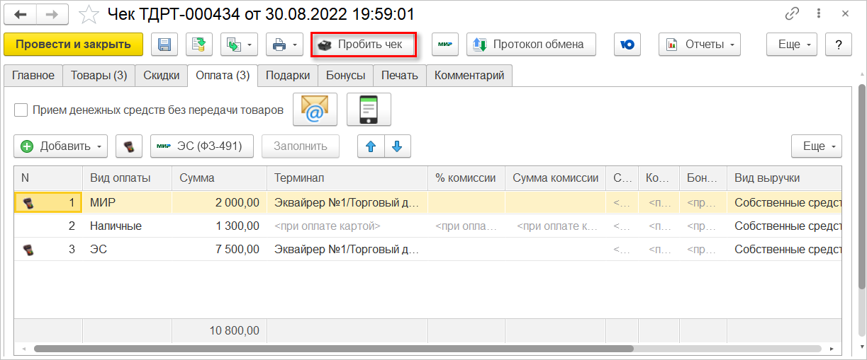 Если операция продажи оформляется непосредственно в документе Чек, то нужно не забывать после проверки оплаты нажимать кнопку Пробить чек.