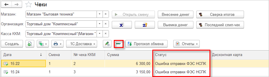 На форме списка "Чеков" отобразится ошибочный статус, а на форме самого документа отобразится описание ошибки. В данном случае потребуется отправить подтверждение повторно, используя одноименную команду.