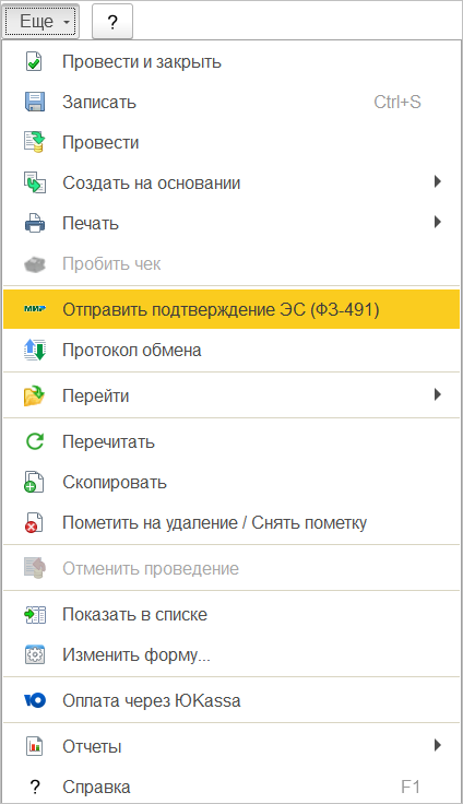 Также операцию можно повторить в форме документа из дополнительного меню Еще с помощью команды Отправить подтверждение ЭС (ФЗ-491).