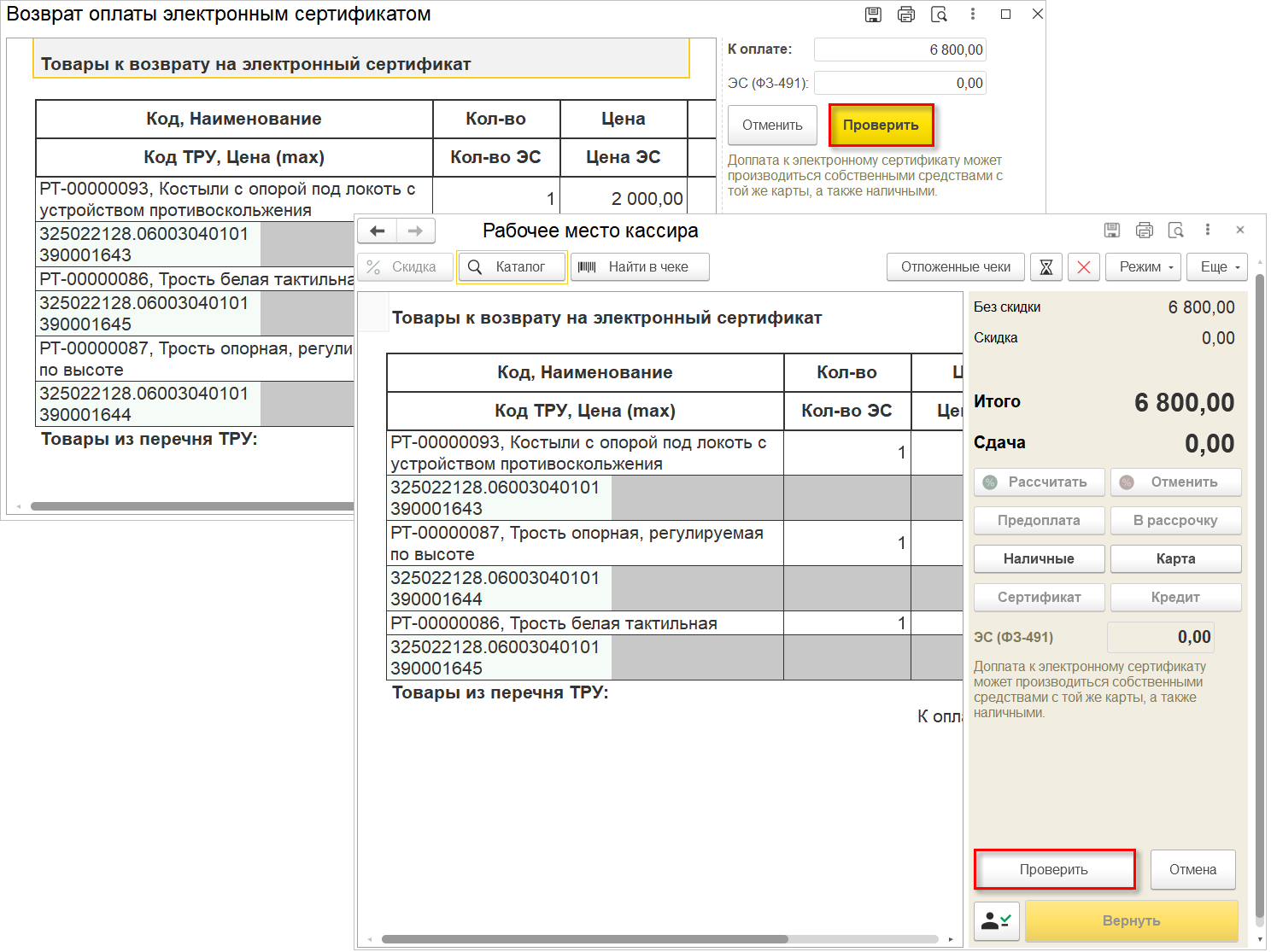 В открывшейся форме проверки оплаты возврата видны все товары и услуги из перечня ТРУ, независимо от того были ли они оплачены за счет средств электронного сертификата или нет. Необходимо нажать кнопку Проверить.