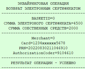 Сведения оригинальной покупки за счет электронного сертификата будут загружены в таблицу. После нажатия кнопки Вернуть будет сформирован слип на терминале, на котором также отображается сумма возврата на электронный сертификат.