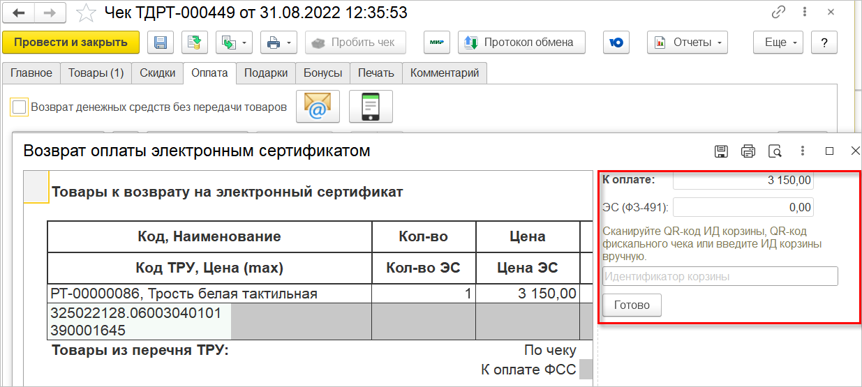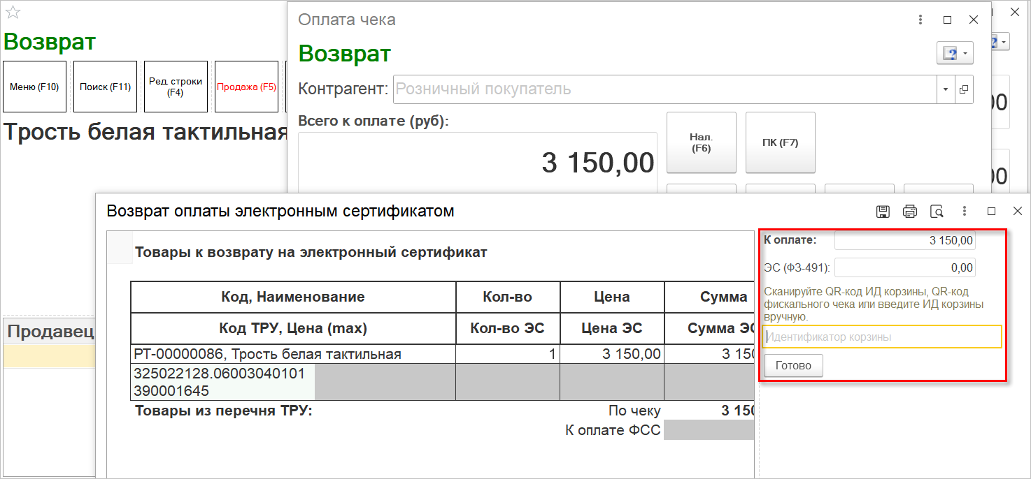 В программе имеется возможность проведения возврата товаров и услуг из перечня ТРУ по идентификатору корзины, без чека основания.