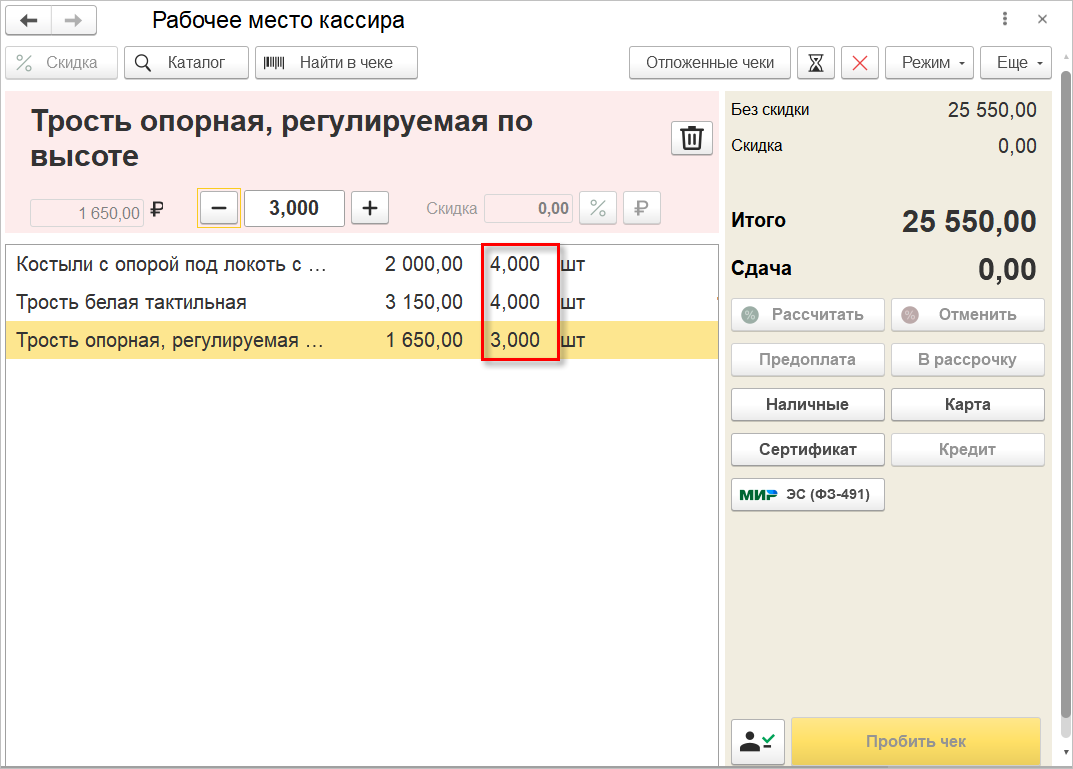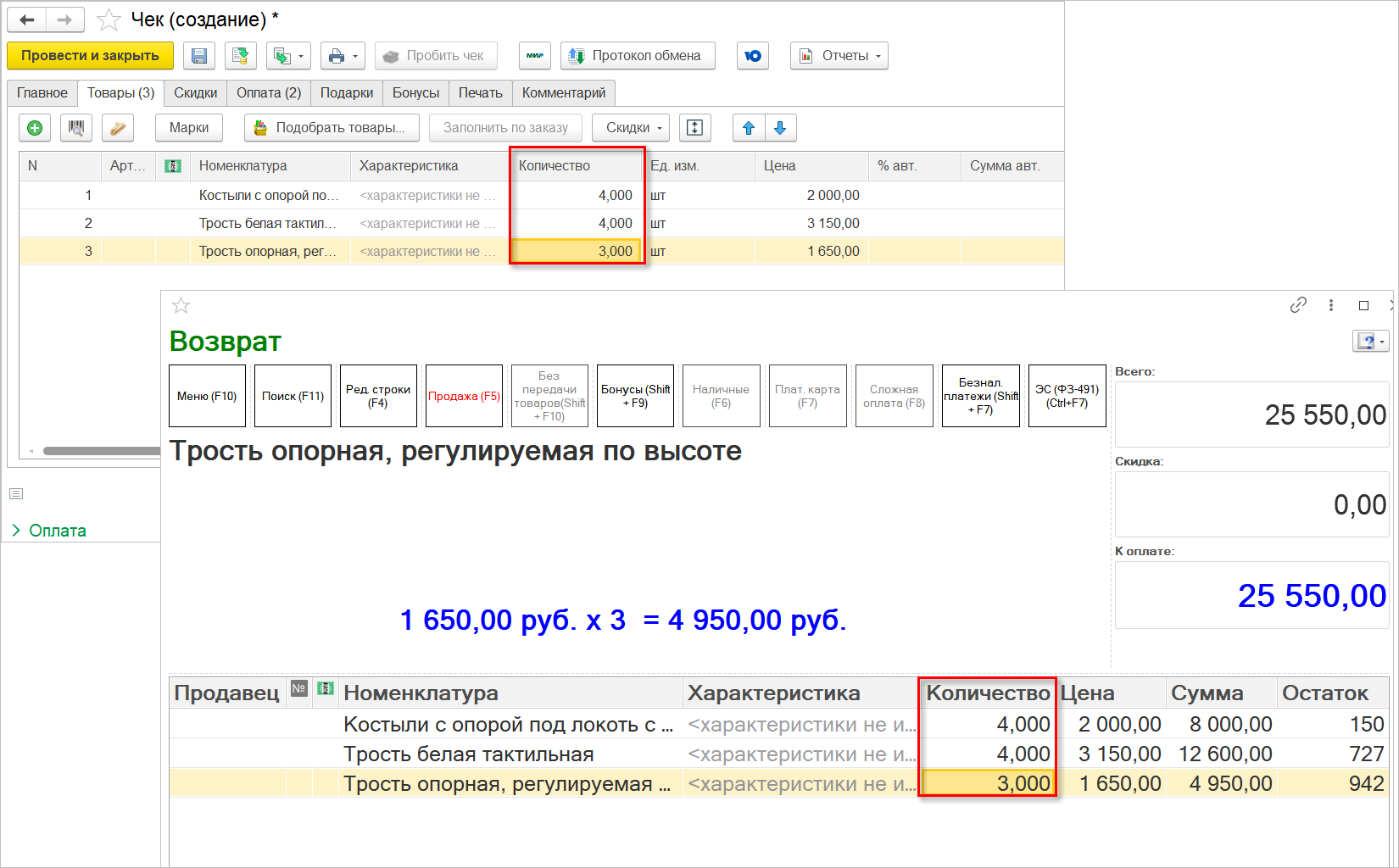 В документе Чек и старом РМК скорректировать количество можно сразу.