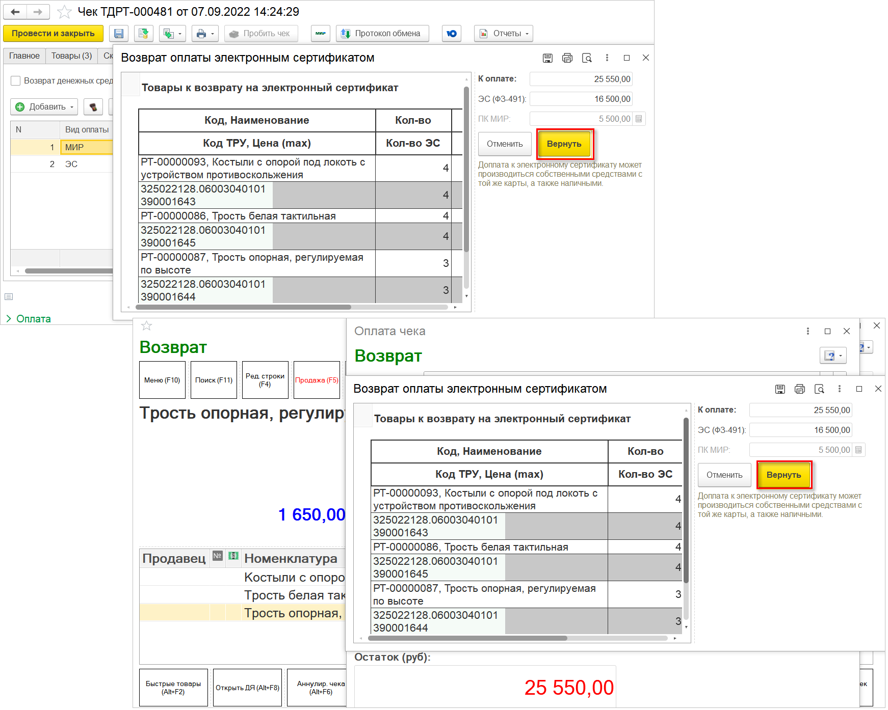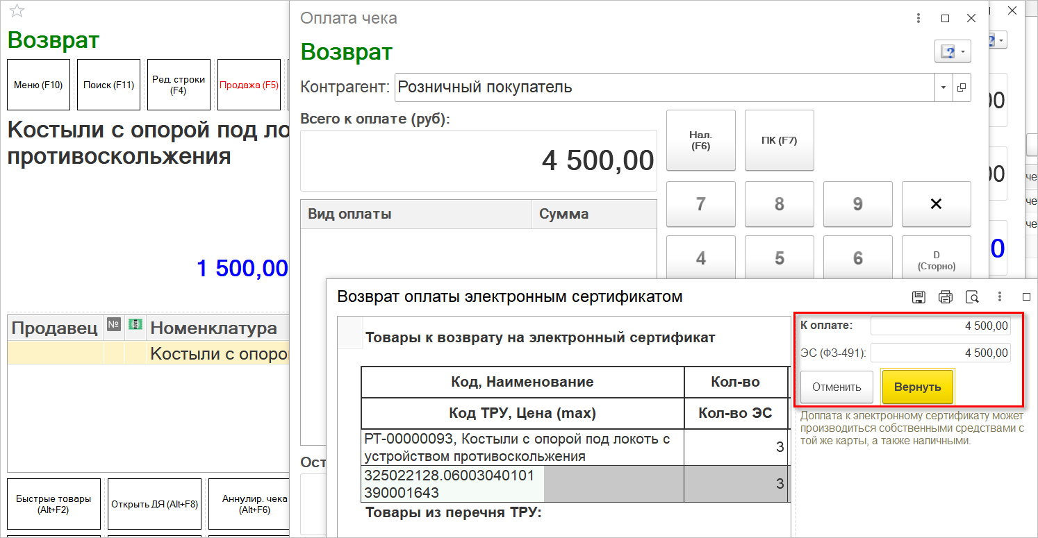 При частичном возврате необходимо сначала исправить количество возвращаемого товара. Причем, в новом РМК после выбора документа продажи открывается форма проверки ЭС, где корзина недоступна для редактирования, поэтому при частичном возврате сначала нужно нажать кнопку Отмена и исправить состав корзины.