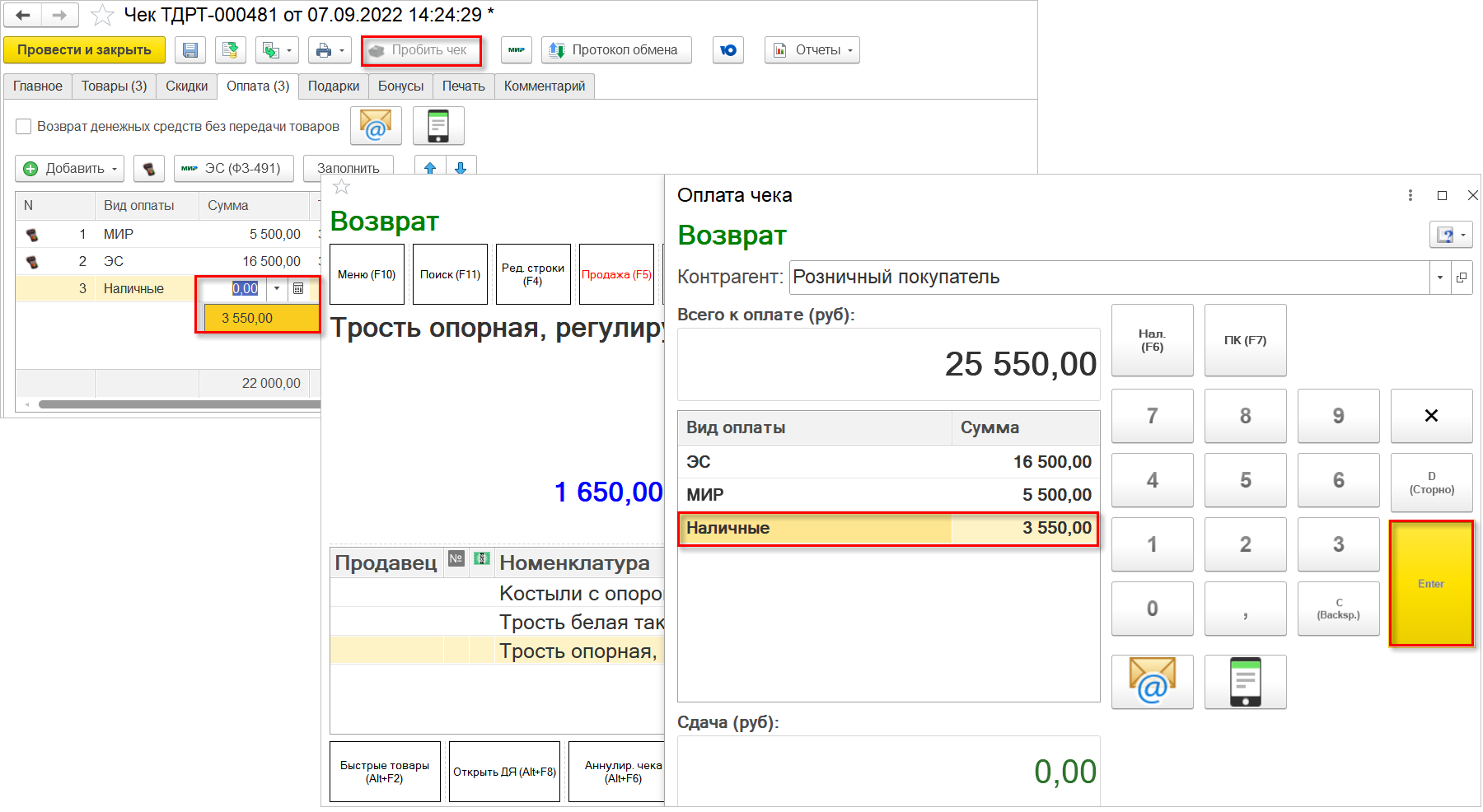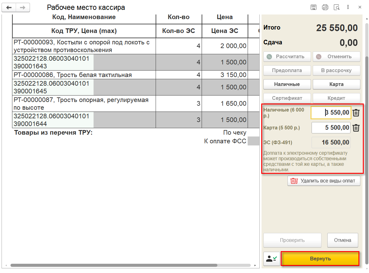 Кассиру нужно внимательно проверить суммы к оплате, при необходимости добавить оплату наличными и пробить чек.