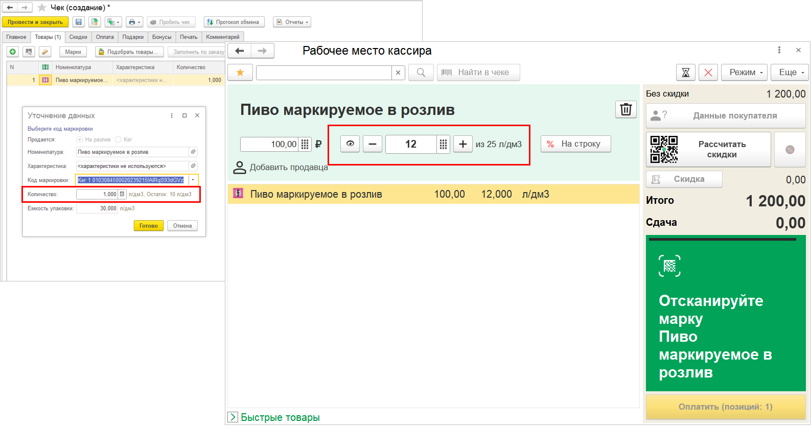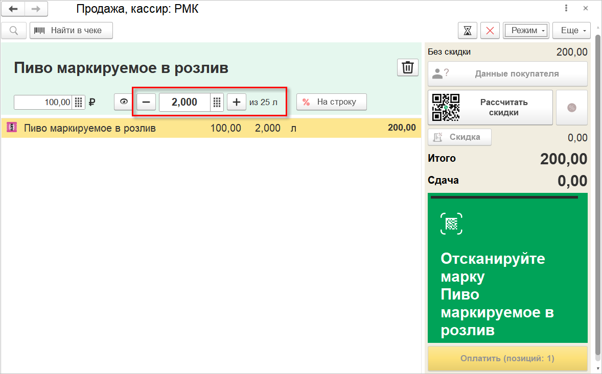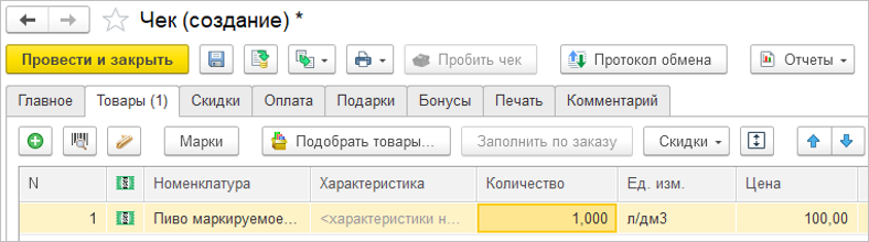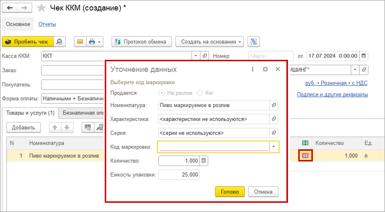 Для оформления розничной продажи используется номенклатура, учитывающаяся в литрах с признаком "В розлив". Подбирать товар можно вручную или сканированием штрихкода ean, при этом кассиру потребуется уточнить продаваемое количество. Справа от количества будет отображаться объем тары.