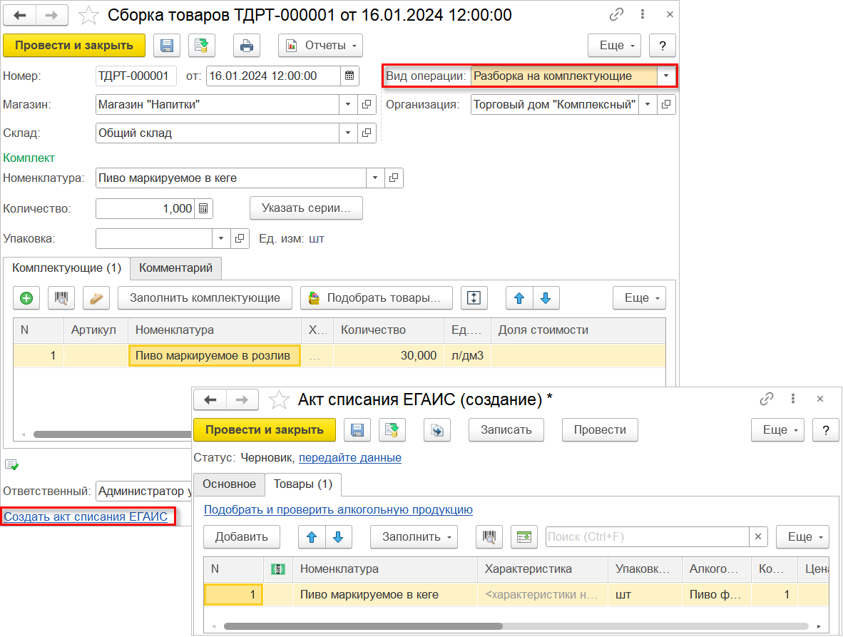 После получения входящего электронного УПД от поставщика в созданном документе "Поступление товаров" потребуется считать марки полученных кегов. При передаче кега в торговый зал рекомендуется использовать документ "Сборка товаров" с видом операции "Разборка на комплектующие", который отразит факт вскрытия тары. При проведении документа автоматически будет сформирована гиперссылка для создания документа "Акт списания ЕГАИС", предназначенного для отражения выбытия алкогольной продукции.
