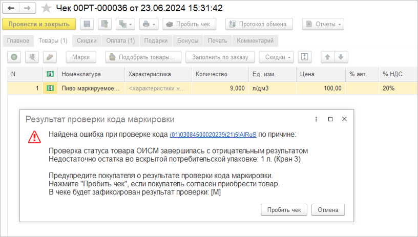 При фискализации чека с частично выбывающей продукцией остаток продукции по данным информационной системы автоматически пересчитывается. Если остаток продукции ниже "0", то код маркировки автоматически становится неактивным и больше не участвует в подборе. При этом пустой кег будет отключен автоматически.
