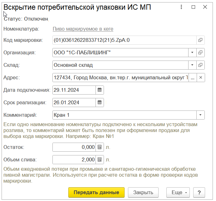 Отключить кег от крана можно автоматически при регистрации подключения нового кега или вручную, воспользовавшись командой "Отключить" форме "Вскрытие потребительской упаковки ИС МП". При этом потребуется указать конкретный кег, если подключено несколько, а затем передать данные в ГИС МТ по кнопке "Передать данные".